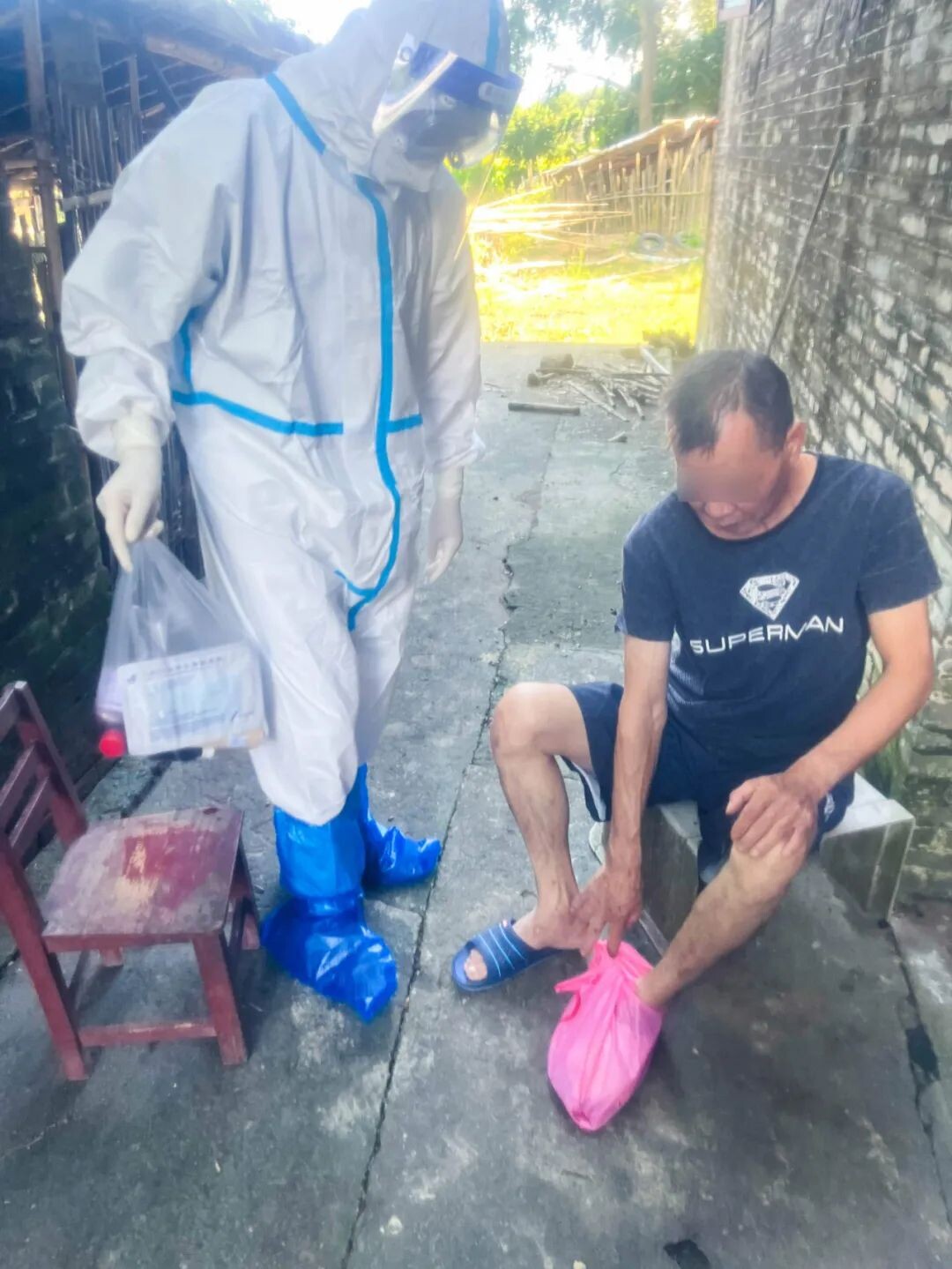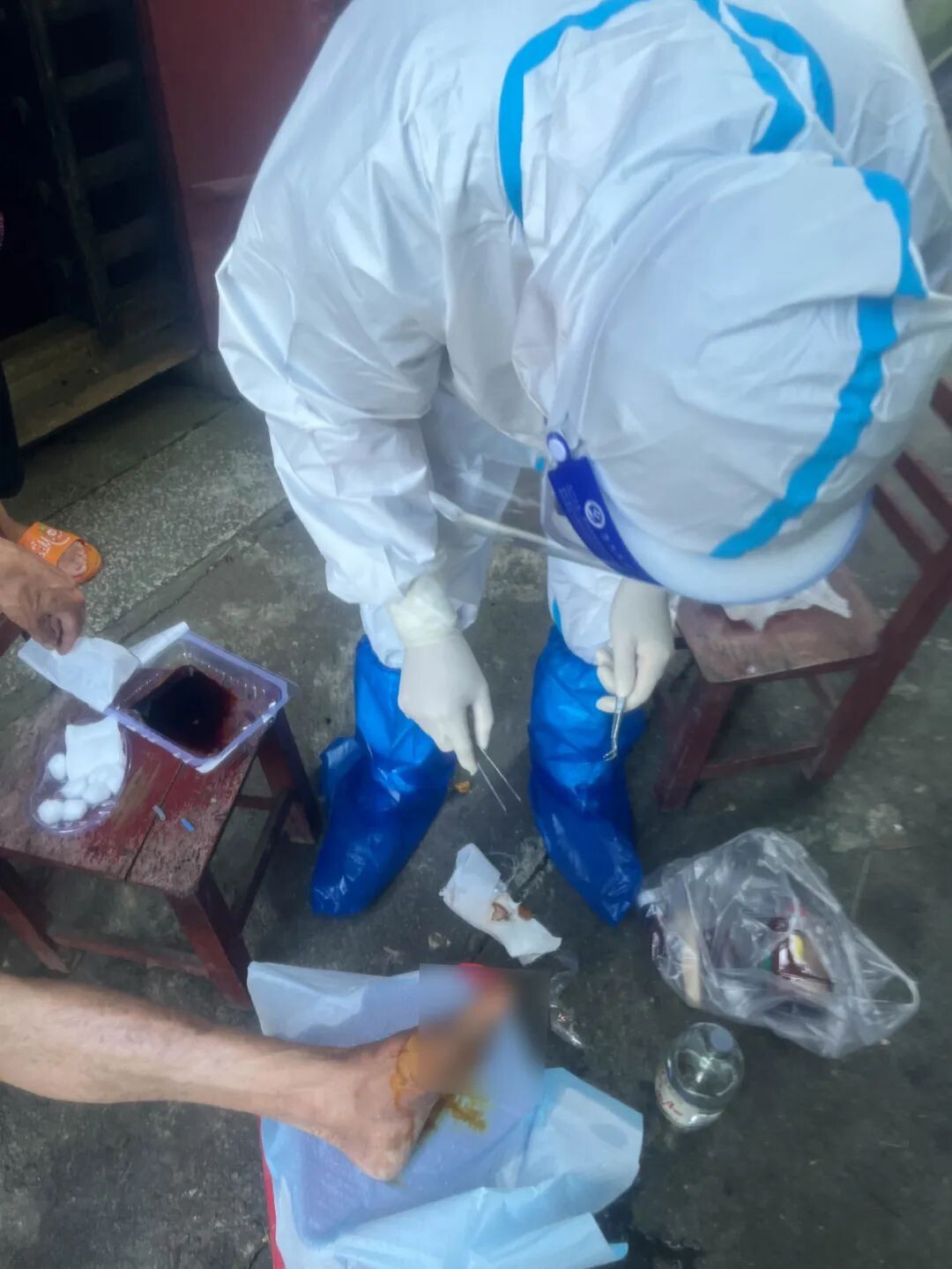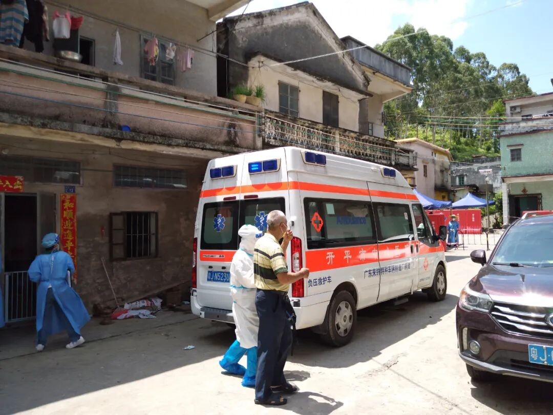 由于核酸采樣派出了大量人員,導(dǎo)致院內(nèi)人手緊缺,為了保障群眾繼續(xù)得到良好醫(yī)療服務(wù),市中心醫(yī)院醫(yī)務(wù)人員主動(dòng)取消休假,堅(jiān)守崗位,哪怕要到風(fēng)險(xiǎn)區(qū)去,也毫不猶豫。7月10日,我院急診科出車到中風(fēng)險(xiǎn)區(qū)赤坎五堡,為糖尿病足行左足第一趾截肢術(shù)后一個(gè)月的患者進(jìn)行換藥。
