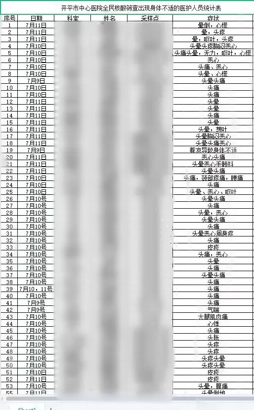 成功的背后離不開(kāi)艱苦的付出和無(wú)我的奉獻(xiàn),下面這張圖截取的是一部分核酸采樣身體不適醫(yī)務(wù)人員統(tǒng)計(jì)表。