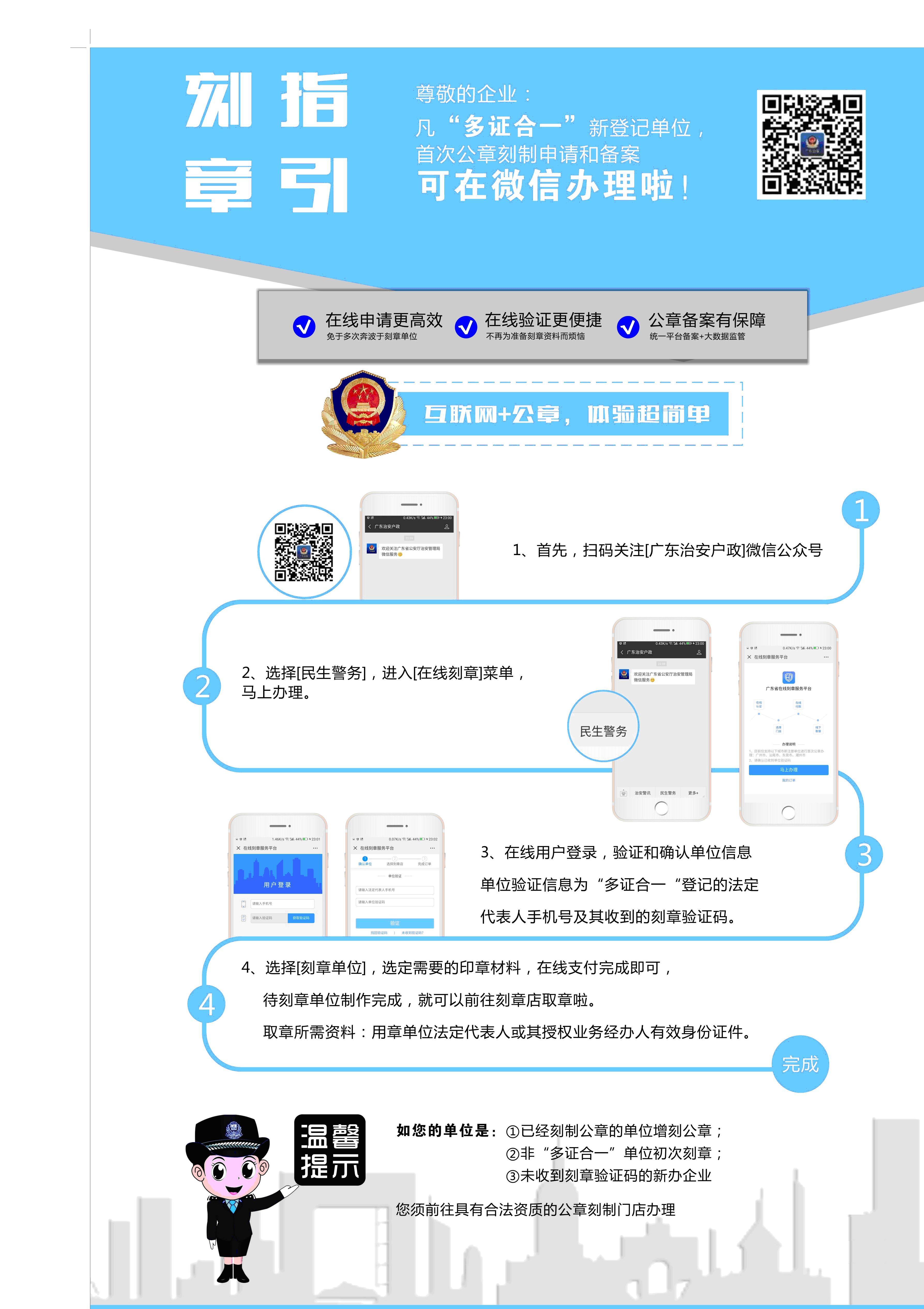 2018年,廣東省公安廳在全省推廣使用廣東省公章治安管理信息系統,創新推出了手機端在線刻章便民服務。江門市全面推進“互聯網+公章”服務與監管新模式,并于2018年10月1日正式上線廣東省公章治安管理信息系統。10月20日全市范圍內全面取消非芯片公章備案,新制作及因磨損、丟失等需要重新更換的公章須統一嵌入安全芯片。