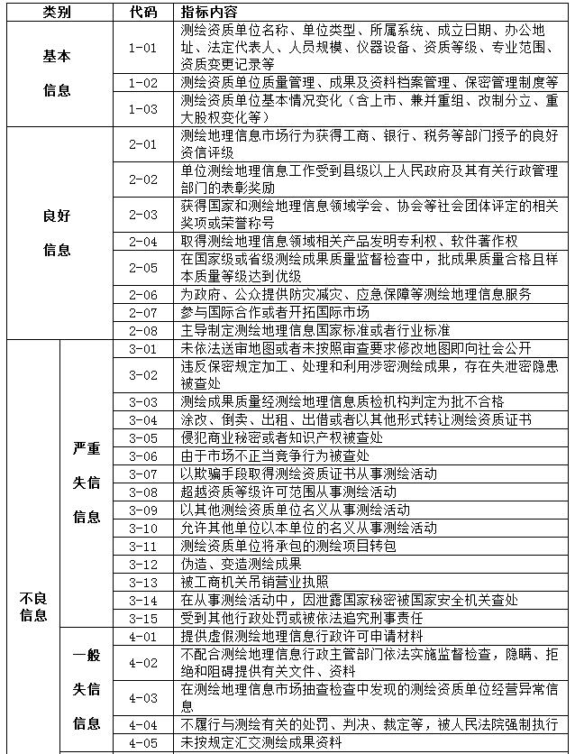第五條 依照《測繪地理信息行業信用指標體系》,測繪資質單位信用信息由基本信息、良好信息和不良信息構成: