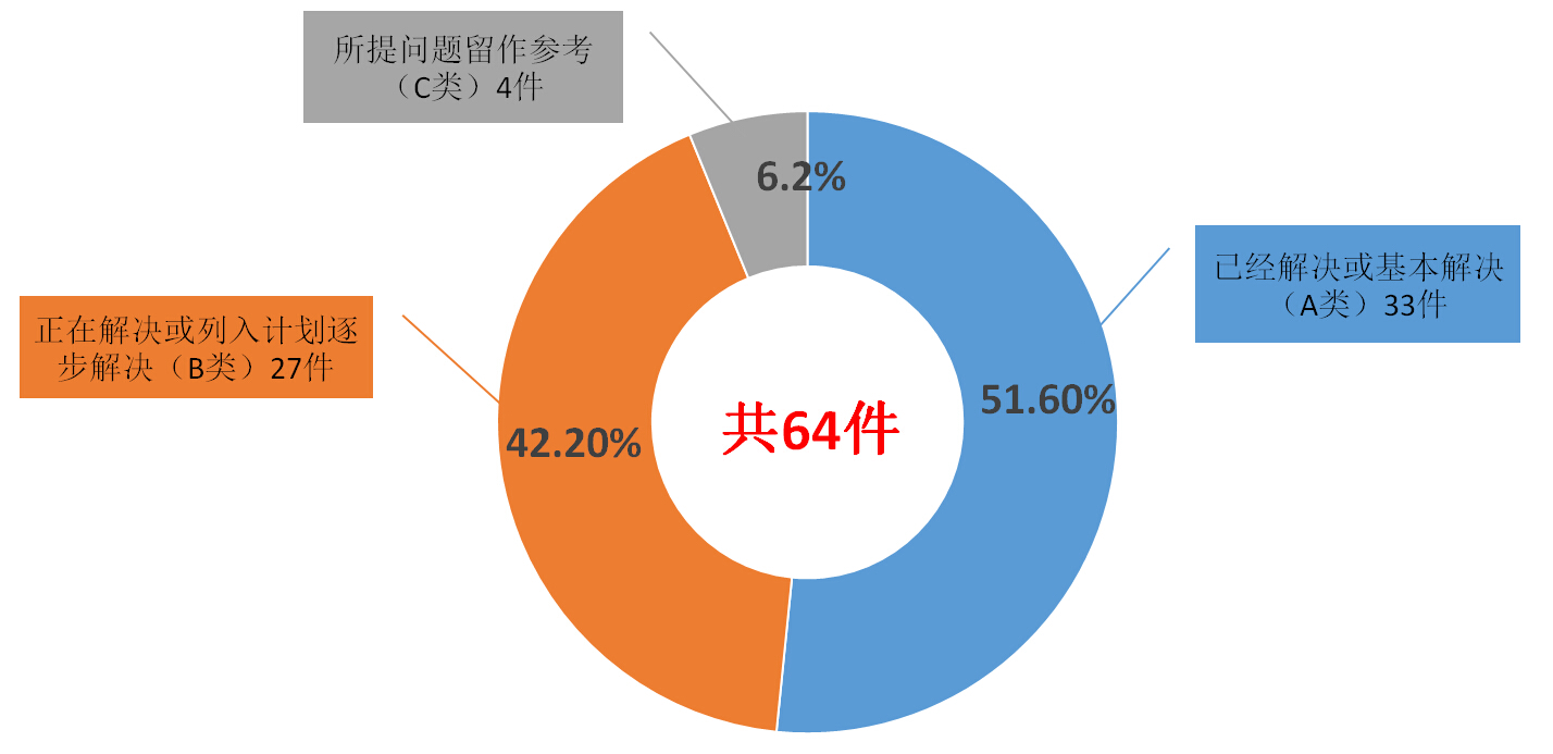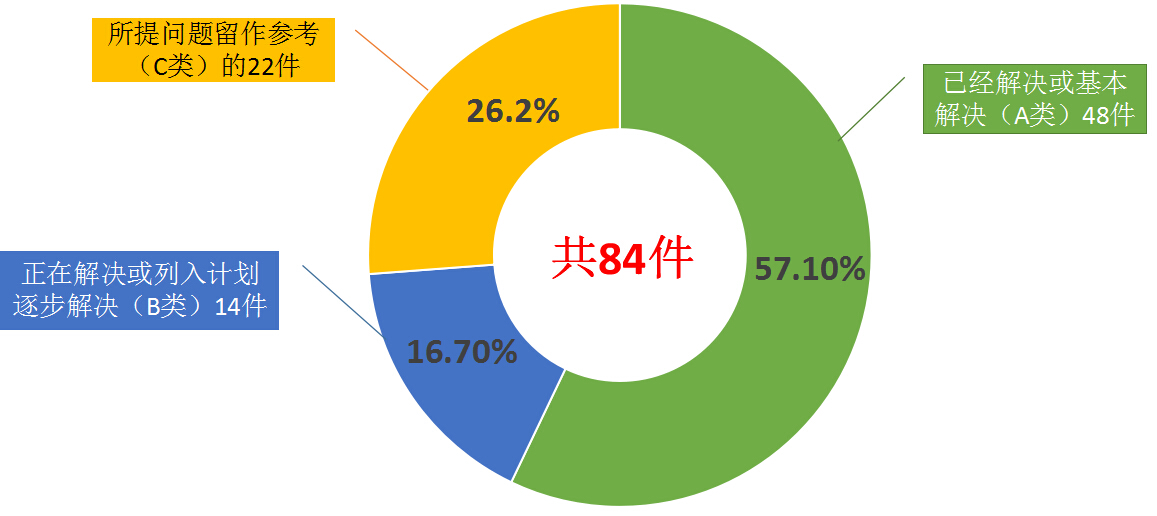 政協開平市十二屆六次會議期間,政府系統共收到政協提案64件。截至2015年9月底,本次提案已全部辦理完畢,辦復率100%。其中已經解決或基本解決(A類)的有33件,占提案總數的51.6%;正在解決或列入計劃逐步解決(B類)的27件,占42.2%;所提問題留作參考(C類)的4件,占6.2%。委員對提案辦復的滿意或基本滿意率達到100%。