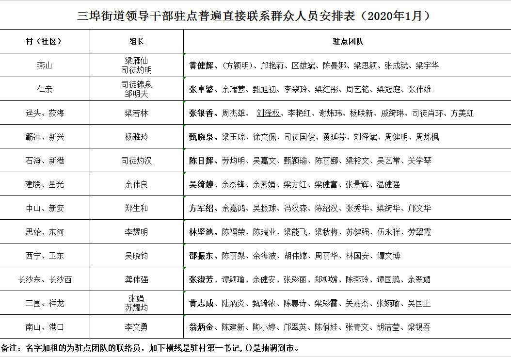 三埠街道領導干部駐點普遍直接聯系群眾人員安排表(2020年1月)