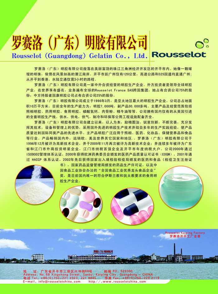 羅賽洛(廣東)明膠有限公司(以下稱“羅賽洛公司”)是由享有世界盛名的Rousselot France SAS跨國公司和開平明膠公司共同合資成立,外資占75%股份,中方占25%股份。公司主要研發和生產明膠產品,年生產明膠8217t,包括照相明膠、藥用明膠和食用明膠。產品遠銷歐美及世界其他國家和地區。