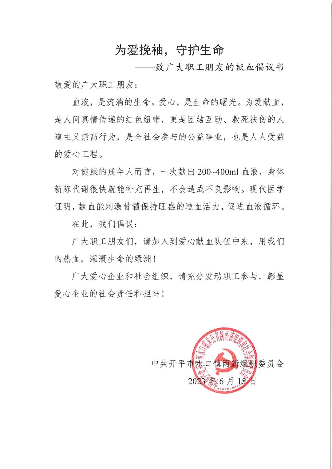 涓滴之血匯聚生命力量,顆顆愛心點燃希望之光,水口鎮“兩新”黨委計劃于6月21日組織開展無償獻血活動。