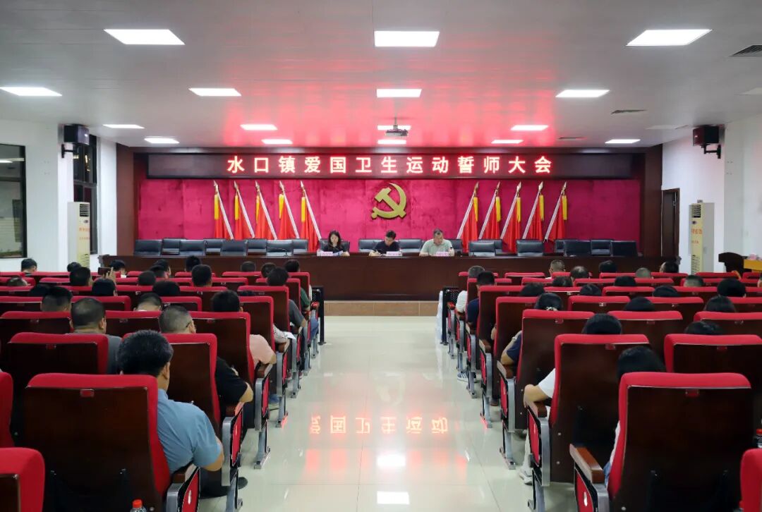 10月17日晚,在鎮政府會場,水口鎮全體領導班子成員、駐村組負責人、村(社區)書記等80多人參加全鎮愛國衛生運動誓師大會,明確“全域動員、全民參與、全力攻堅”的目標任務,建立“黨政主導+部門協作+村居響應+全民參與”的全域防控體系,將背街小巷、農貿市場、閑置地塊等重點區域整治任務進行分片包干。同時,強調要以“時時放心不下”的責任感,把愛國衛生運動打造成民生工程、民心工程!“我們將發揮專業消殺隊作用,加大重點區域消殺頻次!”“黨員先鋒隊將帶頭開展‘敲門行動’,入戶清積水,滅蚊蟲!”各部門代表依次表態,擲地有聲的承諾掀起誓師熱潮。