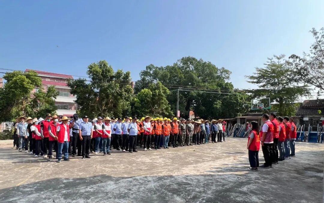 村級主會場的誓師儀式同樣熱血沸騰。10月18日早上,開平市委常委、市委辦公室主任、統戰部部長伍德斌,江門市供銷社副主任、供銷集團董事長鄺衛民,水口鎮黨委書記司徒錦泉,鎮黨委副書記、鎮長胡萬程以及支援單位服務隊、鎮民兵隊伍、綜合行政執法隊、義工志愿者、環衛工人等200多人齊聚紅進沖奕村,掀起以“兩清一滅”為核心的全域全員愛國衛生運動熱潮。