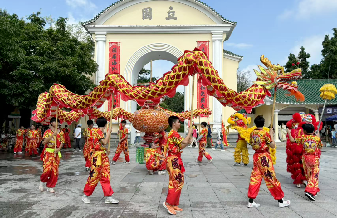 在立園內,每天安排三場演出,泮村花燈展示、泮村燈會巡游展演、開平民間雜技表演等非遺項目輪番登場,非遺展演與僑鄉建筑相映成趣,吸引大批游客駐足。