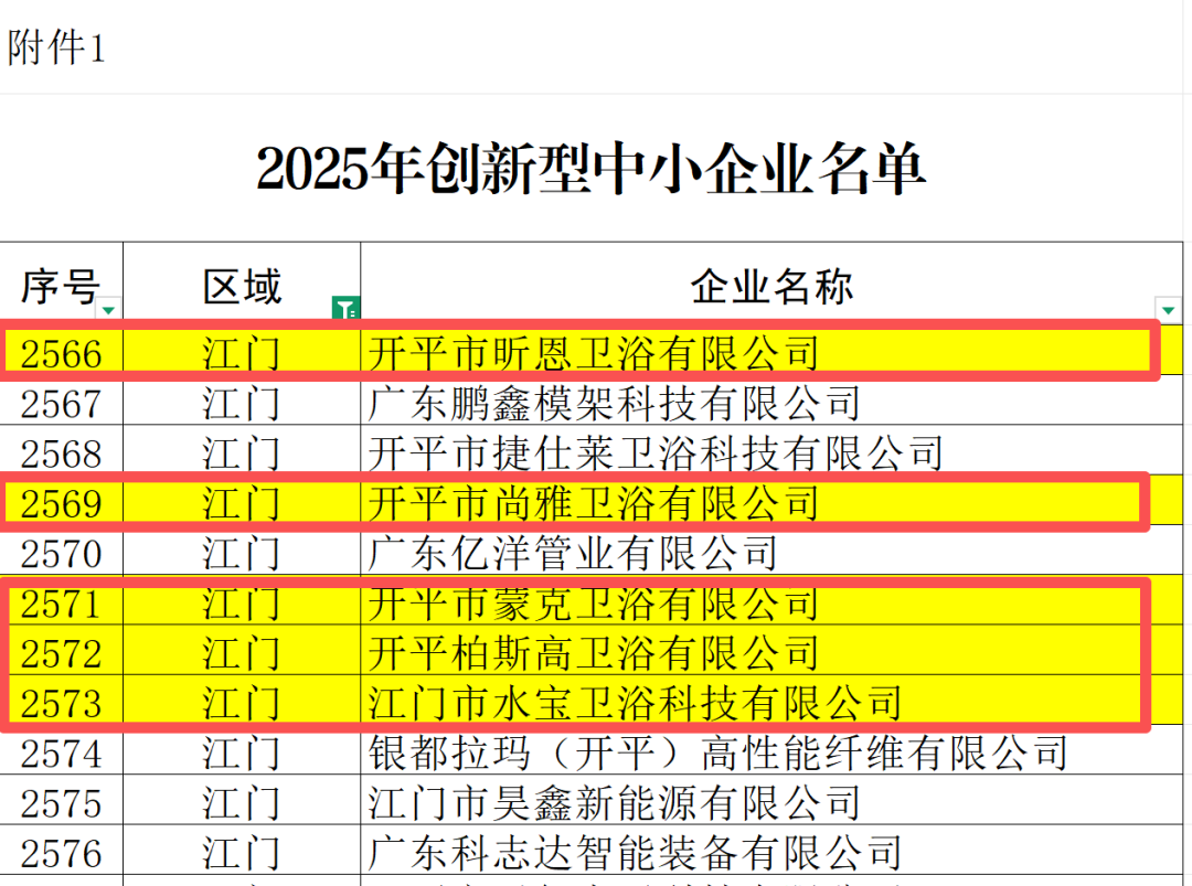 日前,廣東省工業(yè)和信息化廳公布了2025年創(chuàng)新型中小企業(yè)和通過復(fù)核的創(chuàng)新型中小企業(yè)名單,水口鎮(zhèn)5家企業(yè)新入選省創(chuàng)新型中小企業(yè)名單,分別為:開平市昕恩衛(wèi)浴有限公司、開平市尚雅衛(wèi)浴有限公司、開平市蒙克衛(wèi)浴有限公司、開平柏斯高衛(wèi)浴有限公司、江門市水寶衛(wèi)浴科技有限公司。