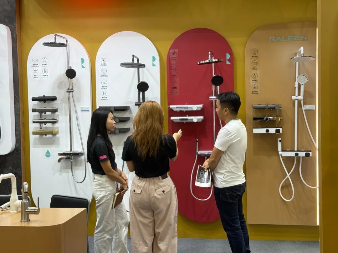 在展廳的另一側,開平市瑞霖淋浴科技有限公司的展位前同樣人頭攢動。董事長馮繼君介紹,此次推出的新品其核心亮點在于“綠色制造”,不僅廣泛采用環保材料,更融合了先進的節水技術,精準契合了國際市場對節能環保產品的需求?!拔覀兊漠a品在確保功能性的同時,在環保與節水方面也下足功夫。目前已與多家采購商進入深入洽談階段。”馮繼君說。