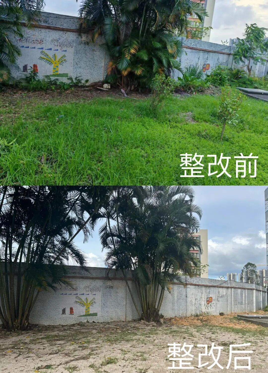 泮村小學(xué)圍墻與鄰近變電站間閑置空地生長的低矮灌木叢,不僅堆積落葉雜物,更是蚊蟲等病媒生物的溫床。水口鎮(zhèn)和泮村村得知情況后迅速組織施工開挖排水溝排積水、清除灌木雜草及垃圾,平整后做硬化處理,根除隱患。