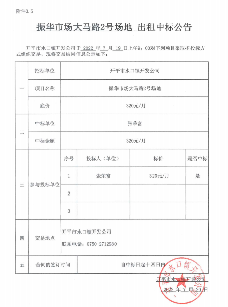 振華市場(chǎng)大馬路2號(hào)場(chǎng)地出租中標(biāo)公告