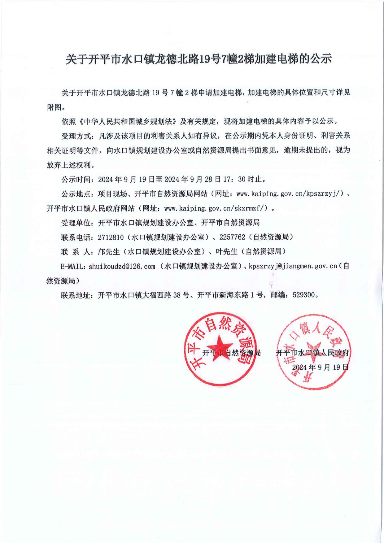 關于開平市水口鎮龍德北路19號7幢2梯加建電梯的公示