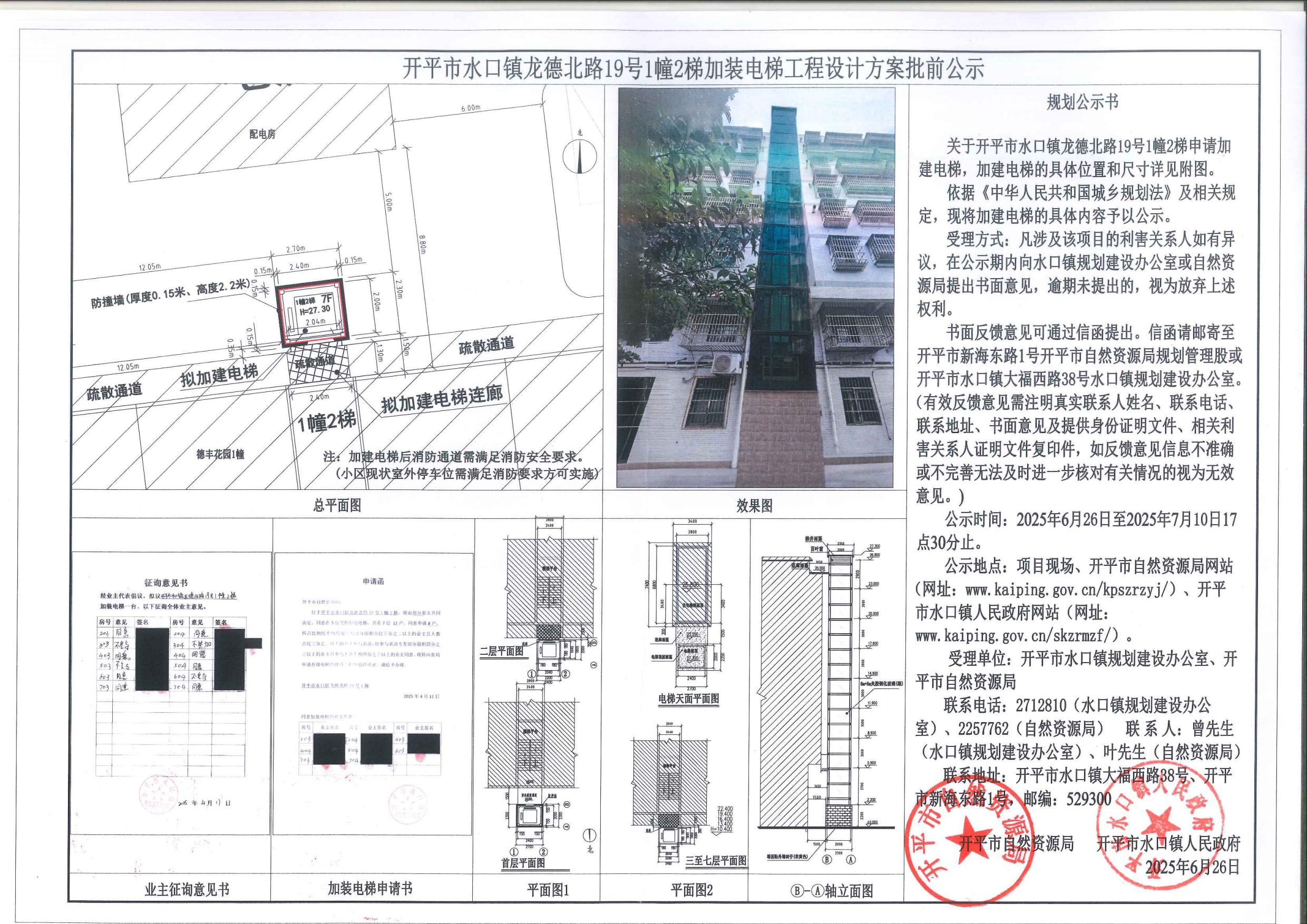 關于開平市水口鎮龍德北路19號1幢2梯申請加建電梯,加建電梯的具體位置和尺寸詳見附圖。