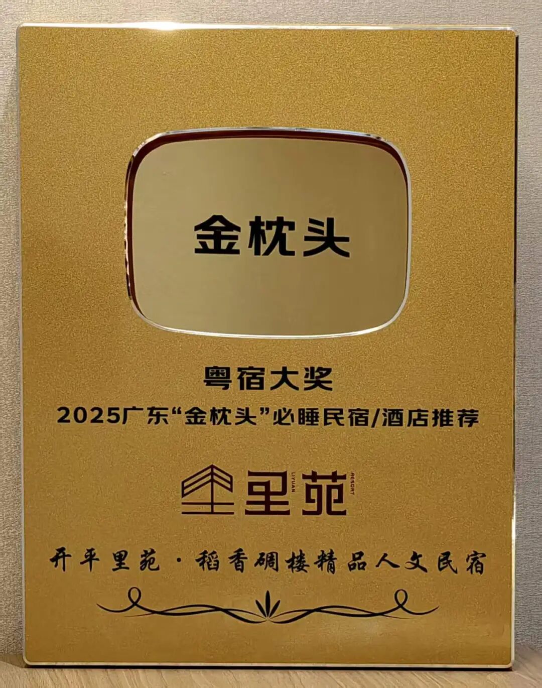 在此次活動中,里苑·稻香碉樓店(江門開平)憑借深厚的人文底蘊以及卓越的品質服務,從眾多參評單位里脫穎而出,斬獲2025年廣東“金枕頭”必睡民宿/酒店推薦粵宿大獎。