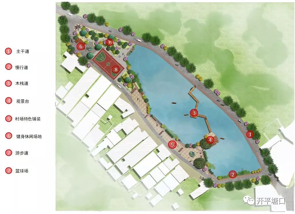 作為村莊的入口場地,將此場地定位為一個健身游玩的活動場所,場地內設置有籃球場、村口游園、村場特色鋪裝以及環湖的慢行道和親水棧道,整體上提升區域綠化豐富場地生態環境,為村民提供一個健康生態的活動場所。