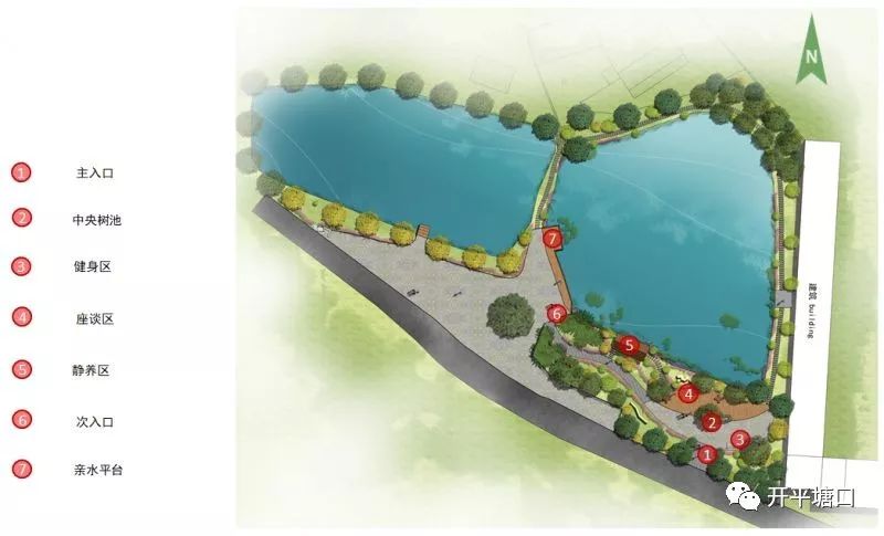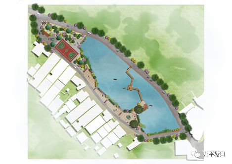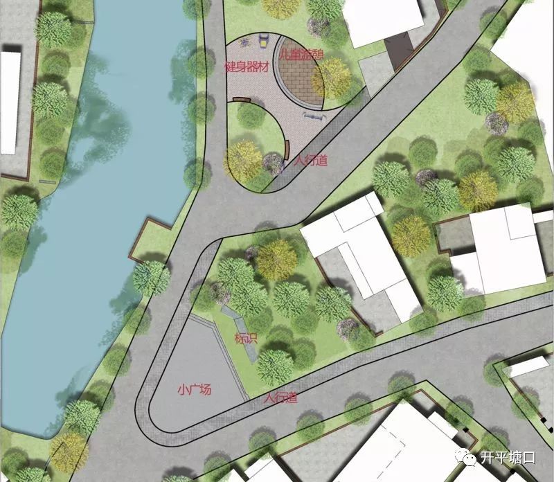 設計動線為環繞池塘邊緣的閉合園路,場地中心設置一塊鋪磚場地,是將運動健身區域與休憩座談相結合的動區,池邊設立一座涼亭供村民喝茶靜養等,場地內保留原有場地的大量綠植,同時優化植物配置,為村民提供一個健康的生態環境。