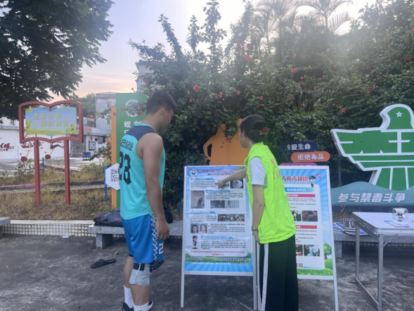 賽場下,禁毒社工向場外的球員們、觀看比賽的群眾派發禁毒宣傳單張、展示仿真毒品模型,用通俗易懂的話語向他們講解《禁毒法》、“6·26”國際禁毒日、毒品的種類及如何防范毒品等知識,并著重介紹了新型毒品依托咪酯“上頭”電子煙的危害及防范措施。